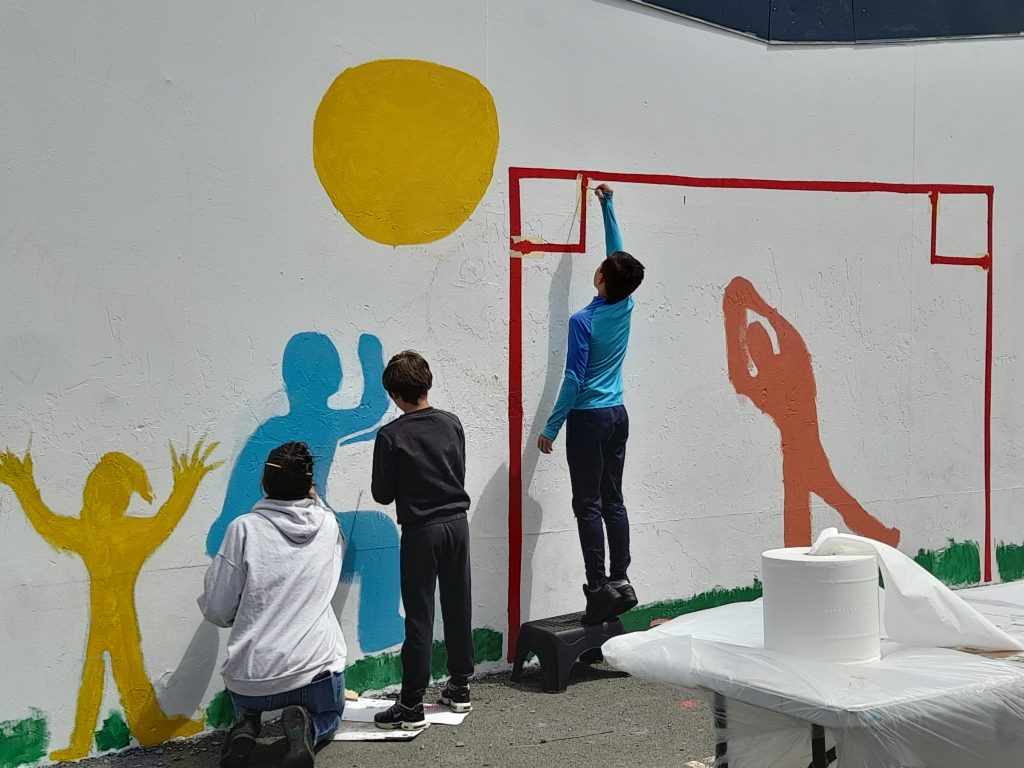 Pendant l’été 2024, en attendant de pouvoir faire intervenir un artiste, nous avons réalisé avec les habitants une première fresque représentant un but de terrain de foot sur le mur contre lequel les enfants jouent au ballon. L’intérêt des familles sur cet atelier qui avait réunit une vingtaine de personnes a confirmé le projet que nous imaginions sur les autres murs du local.