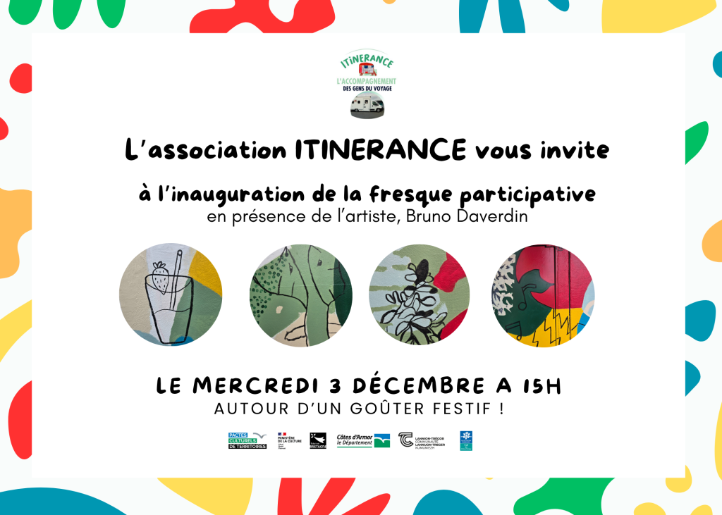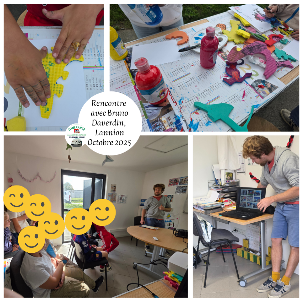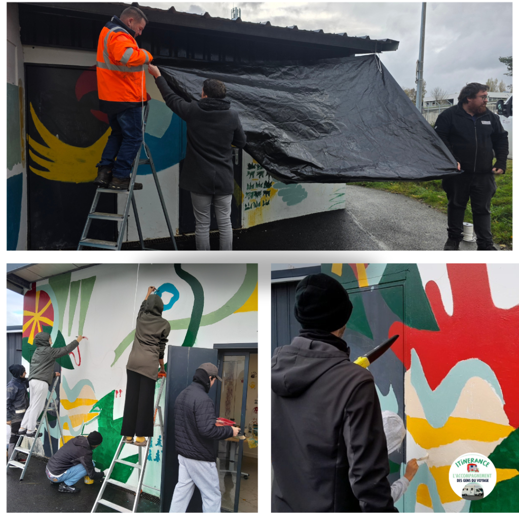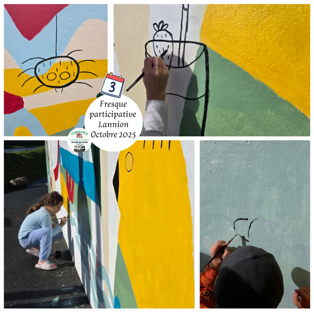 Bruno Daverdin avait déjà travaillé avec les voyageurs de Lamballe et l’association ITINERANCE en 2024 pour réaliser une fresque sur l’aire d’accueil, et était intéressé pour refaire un projet avec nous, nous avons donc organisé sa venue sur le mois d’octobre 2025.