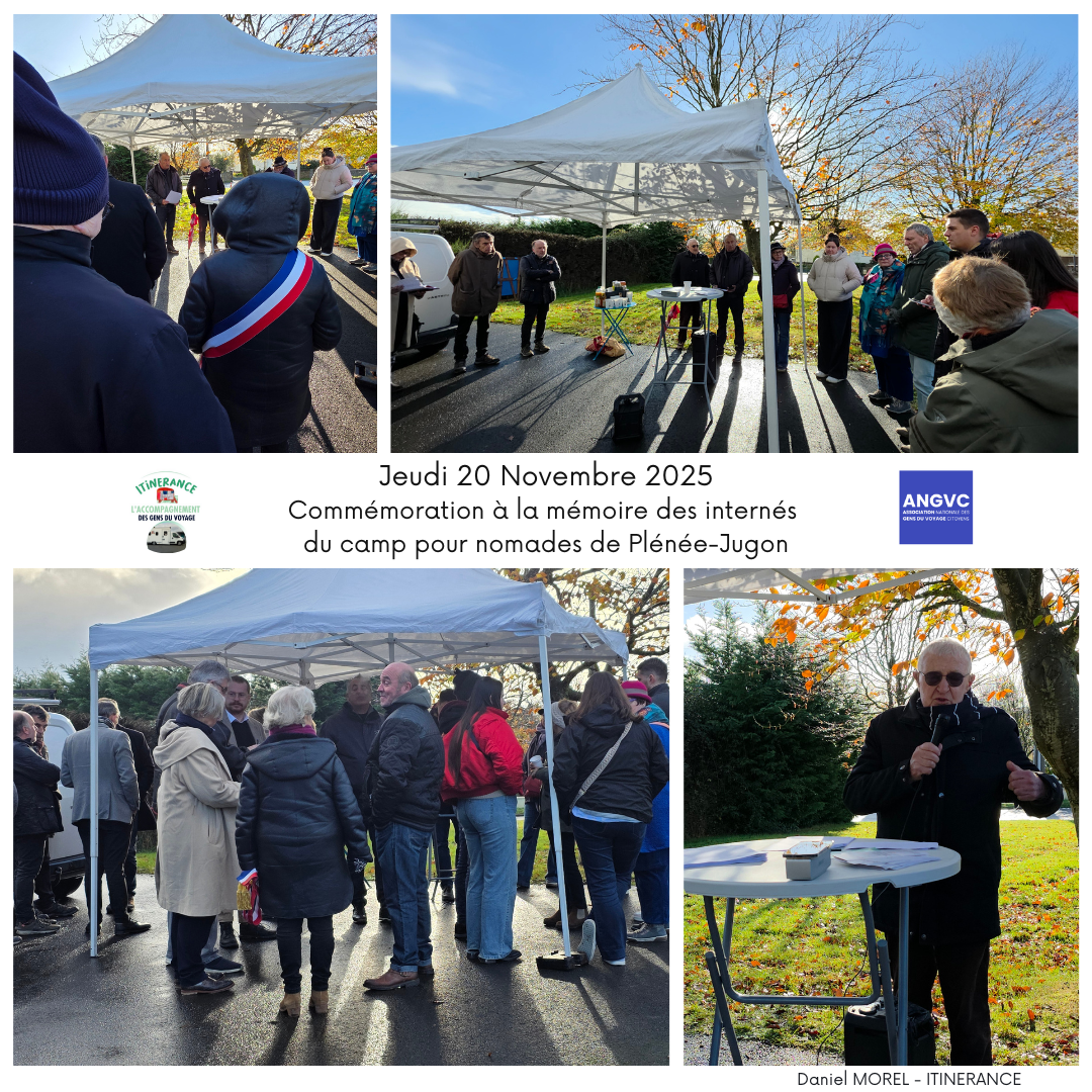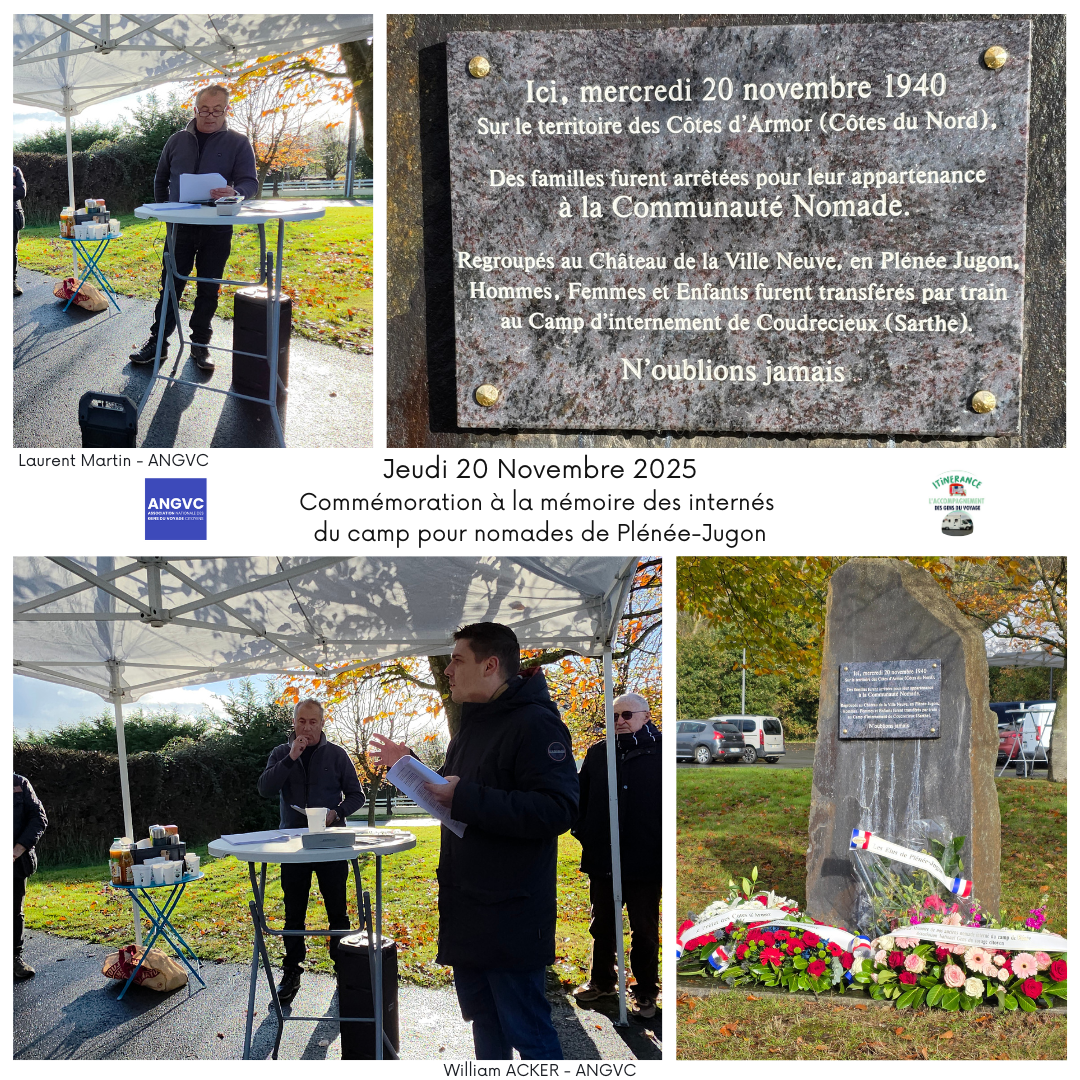 Le Jeudi 20 novembre 2025 se déroulait la commémoration à la mémoire des internés du camp pour nomades de Plénée-Jugon. Découvrez en images le déroulé de la cérémonie avec des discours de Laurent MARTIN, administrateur de l’ANGVC, William ACKER, délégué général de l’ANGVC et Daniel MOREL, ancien président de l’association ITINERANCE ainsi que le témoignage audio de M. René DEBARRE, rescapé de l’internement, en vidéo.